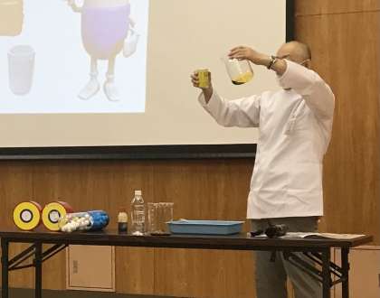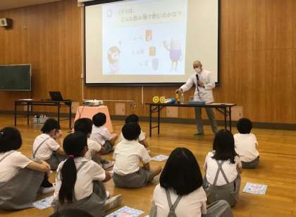 スライドやお話だけではなく、薬を服用する時に使う飲み物の種類によって、薬の色が変わる実験などを目の前で見せていただくことで、子どもたちもくすりを正しく使うことの大切さを実感することができました。