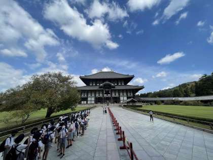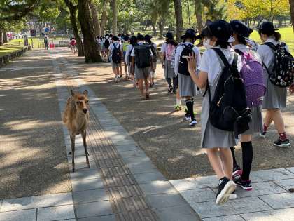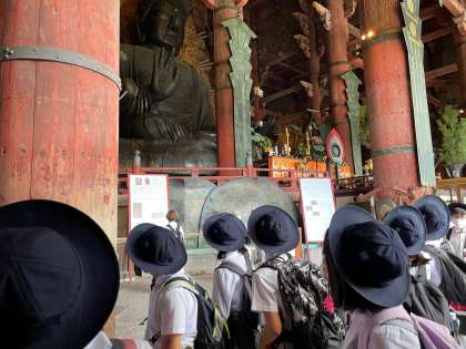 10月になり少しずつ涼しくなってきたところでしたが、今日は天候に恵まれ、快晴の中、子どもたちは暑さを感じる遠足となりました。東大寺までにたくさんのかわいい鹿たちと出会いました。東大寺に着くと、社会の教科書の写真で見ていた大仏が...。実際に見てみて、かなりの大きさだったことを知り、びっくりした様子でした。