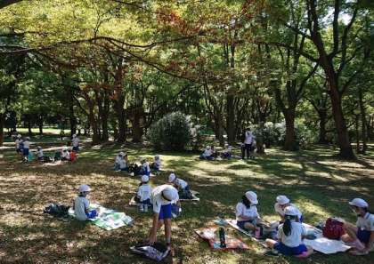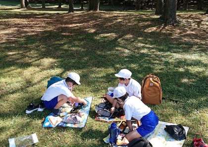 大芝生広場の木陰の涼しいところを選んでシートを広げます。