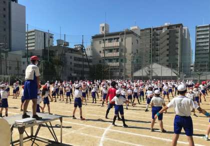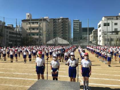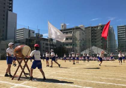 まずは合同で、児童会の代表による選手宣誓、ラジオ体操、そして応援団を中心とした応援練習をおこないました。