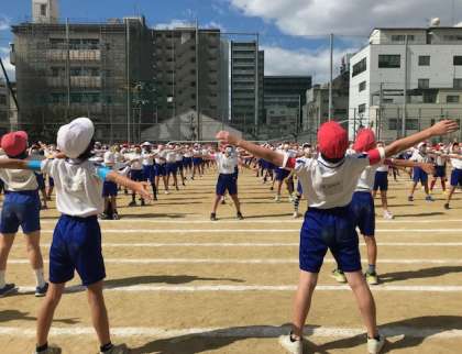 その後、はじめの体操をおこないました。係の児童が前に出てしっかりとお手本を見せていました。