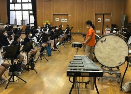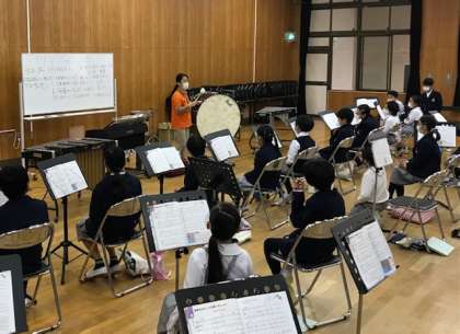 この時間は、5年生が器楽合奏のポイントについて、打楽器の実演を見せてもらいながら集中して学習していました。