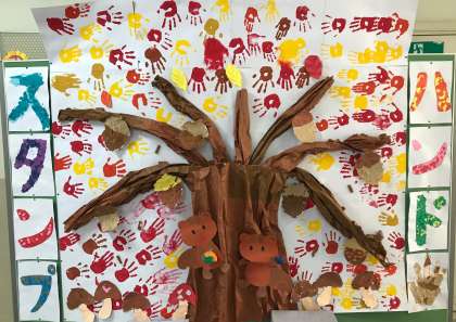 赤や黄に色づく樹をハンドスタンプで表現しました。