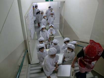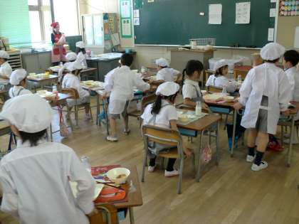 これまでは6年生に運んでもらっていましたが、今日から大おかずや食器、パン箱などすべてを1年生で運搬しています。
