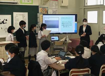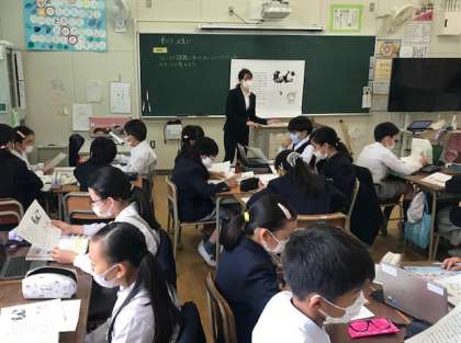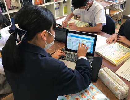 タブレットを使ってプレゼンテーションを作り、クラス全体で共有するという、とても高学年らしい授業です。