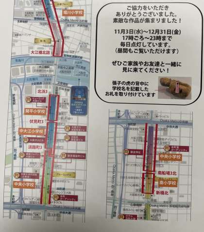 御堂筋で実施中の「御堂筋イルミネーション2021」で、6年生の子どもたちの「虎張子」の作品が展示されています。