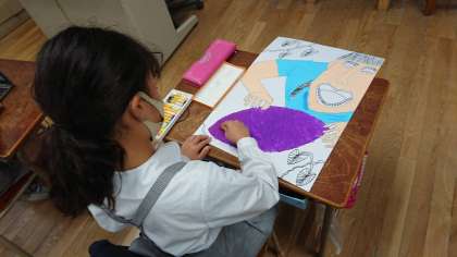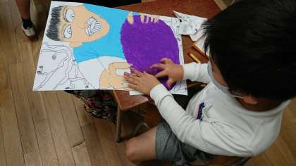 今、図工ではおいもほりの絵をかいています。