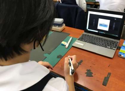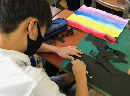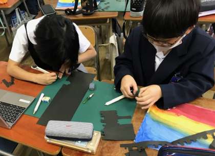 絵の具で背景の夕焼け空を描いたあと、黒い画用紙を切り抜いて、建物を作っていきます。