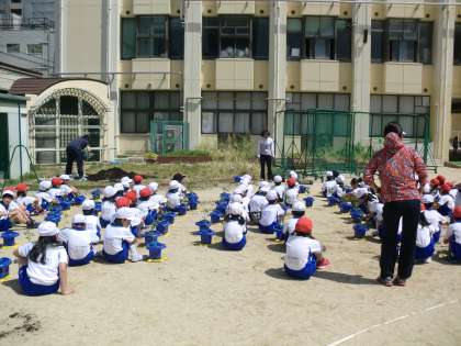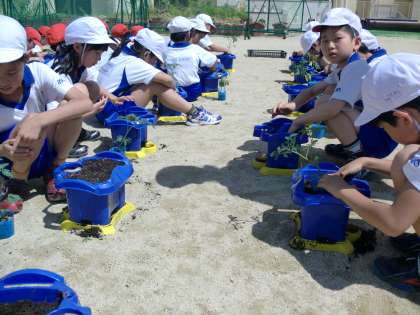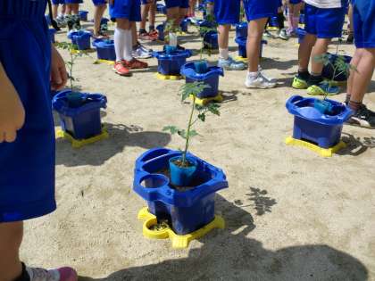 土を入れ、苗を植える分だけ穴を掘り、ミニトマトを植えました。