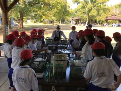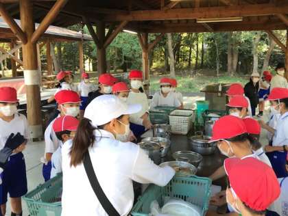 野外炊飯の注意点について、担任の先生からのお話を真剣に聞いています。