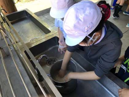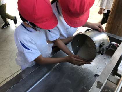 お米を流してしまわないように、慎重に水だけを流しています。