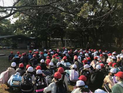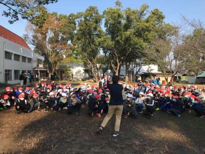 朝食のあとは、広場で「勾玉作り」の活動です。
