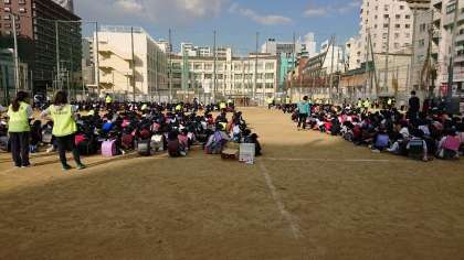 まずは、教室からあわてずさわがず、落ち着いてグラウンドまで避難しました。
