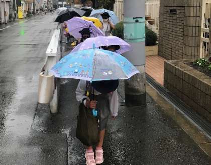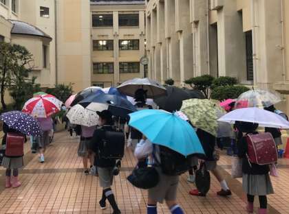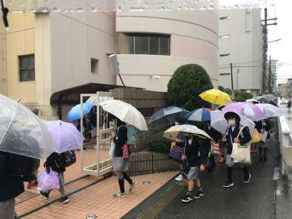 傘をさしながらの登校でしたが、子どもたちは、さわやかにあいさつをしたり、しっかりとおじぎをしたりと、元気な姿を見せてくれました。