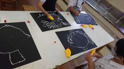 黒いがよう紙にボンドで線をかいているところです。