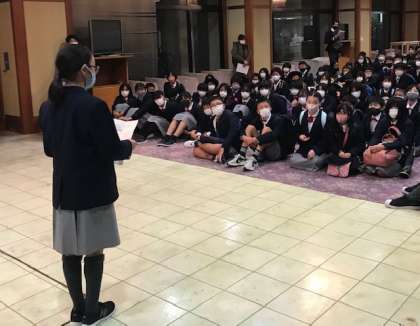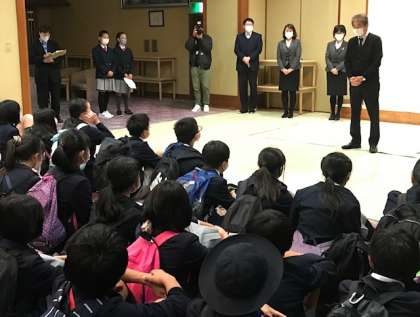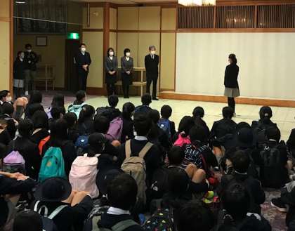 宿舎の志摩ビーチホテルに到着し、開舎式をおこないました。児童代表から宿舎の方にお願いしますとごあいさつをし、宿舎の方からも注意事項等のお話がありました。