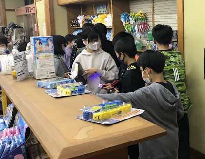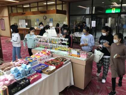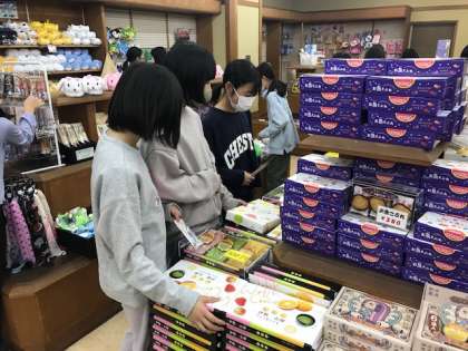 夕食のあとは、半分ずつに分かれて、入浴と買い物を交代でおこないます。買い物は、ホテル1階ロビーにある広々としたおみやげスペースでおこないます。