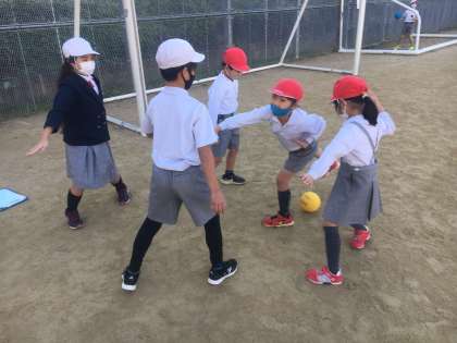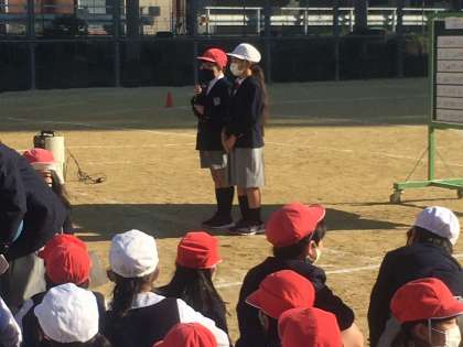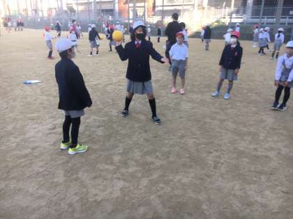 5時間目に、4年生が2年生にボールの投げ方やキャッチの仕方を教えました。