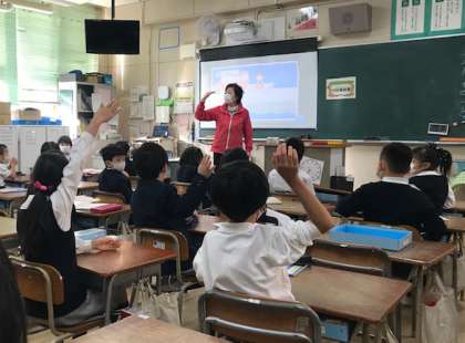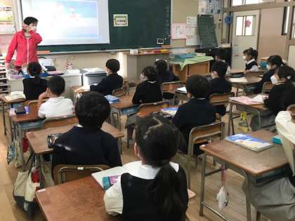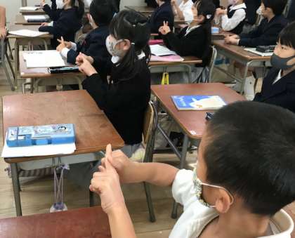 先生と英語でやりとりしたり、アルファベットの形を指で作ったりしています。