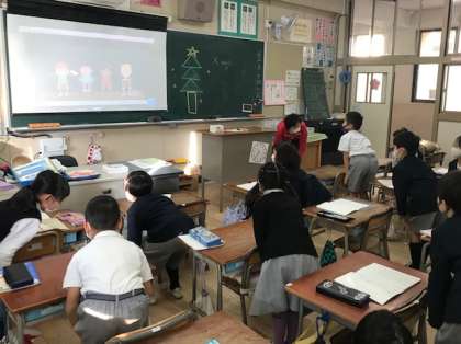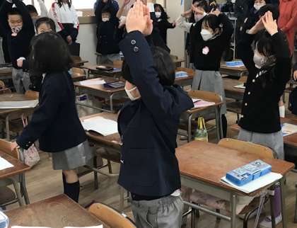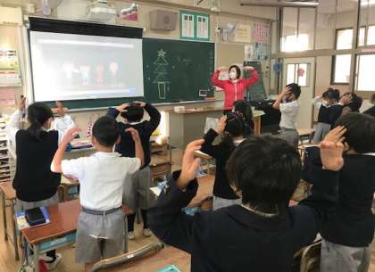 つぎに、英語の歌に合わせて身体を動かしています。みんなが笑顔で英語に親しむとても楽しい時間です。
