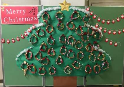それぞれの子が作ったリースを大きなツリーにかざりつけました。