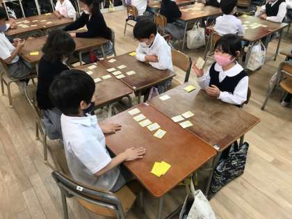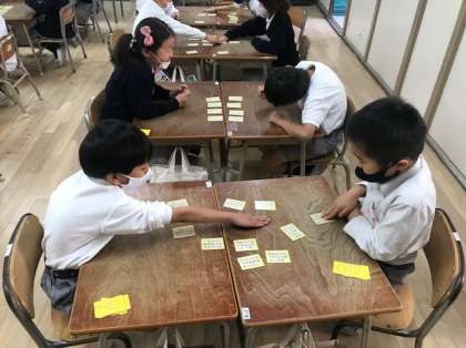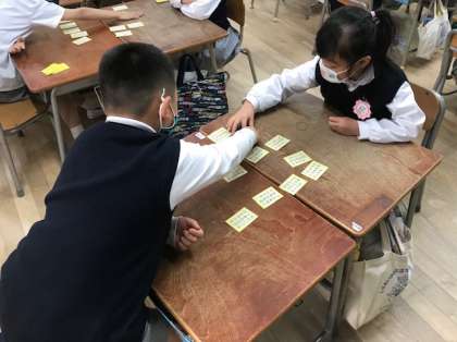 先生が上の句から読みあげ、下の句の札を取り合います。