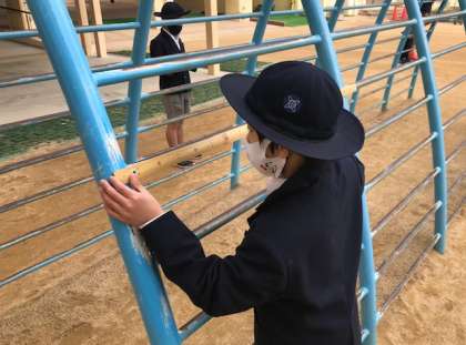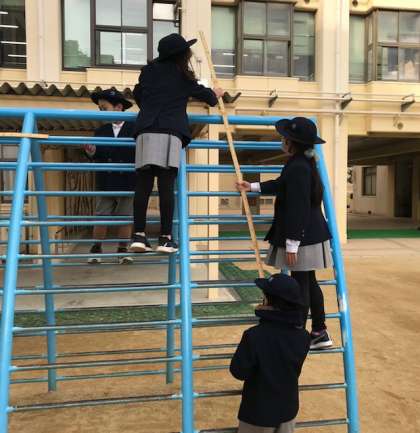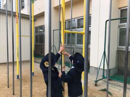 さっそく運動場に出て、ろくぼくの幅や高さ、のぼりぼうの支柱の高さなどを測っています。