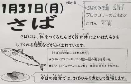 魚には、よい栄養や油が豊富に含まれています。苦手な子も多くいますが、ぜひたくさん食べてほしい食べ物です。ご家庭でも、できるだけ魚を取り入れていただけるとありがたいです。
