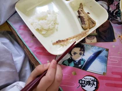 子どもたちは今日の魚には骨があることを知ると、「エーッ!」と驚いた反応をしましたが、上手に骨を取り除きながら、がんばって食べていました。