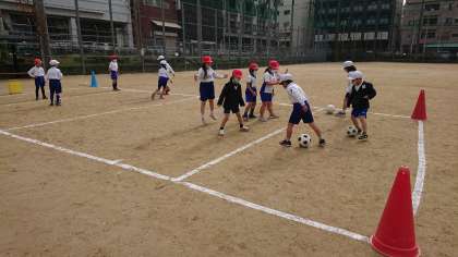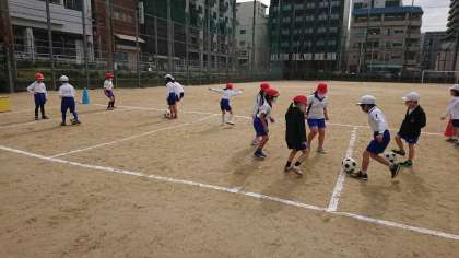 2学きは、ボールを「なげる」ゲームをしましたが、3学きはボールを「ける」ゲームにチャレンジです。