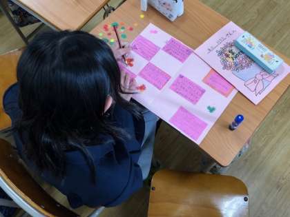 まもなく卒業を迎える6年生への感謝の気持ちをこめて在校生一人ひとりが書いたメッセージカードを5年生がまとめています。
