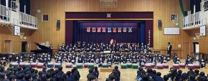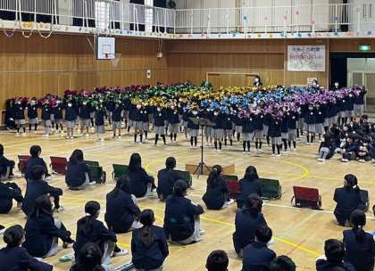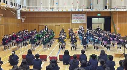 第1部は、1年生・3年生が6年生とともに過ごす時間です。まず、1年生から6年生に、ダンス「あいうえおんがく」をプレゼントしました。
