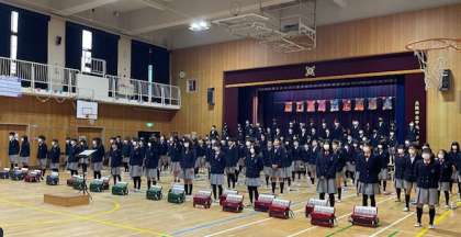 そして最後に、卒業生から在校生に、学校をいつまでもきれいにしてほしいという願いを込めて、ぞうきんが贈られました。