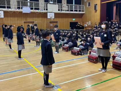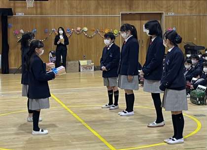 6年生からのプレゼントを受け取ったあと、在校生全員が感謝の気持ちを込めて書いたメッセージカードを、5年生から6年生に渡しました。