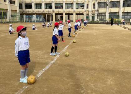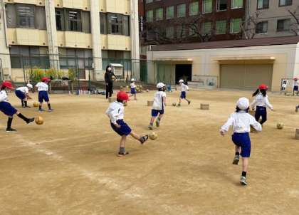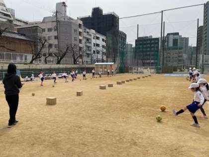 ボールを蹴って箱に当てて、相手のエリアに押し込むゲームをしています。