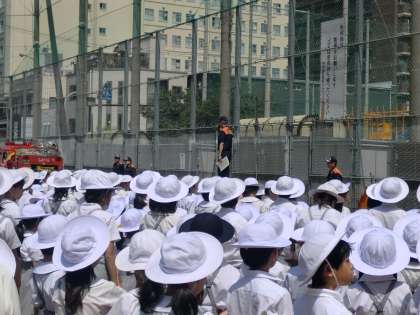 消防署の方からは、火災がおこった時の対応を教えてもらいました。校長先生からは、訓練の大切さや、もしもの時は今日のように落ち着いて行動し先生や大人の指示をしっかり聞きましょうとお話がありました。