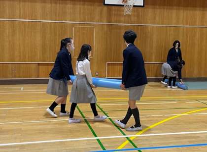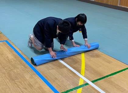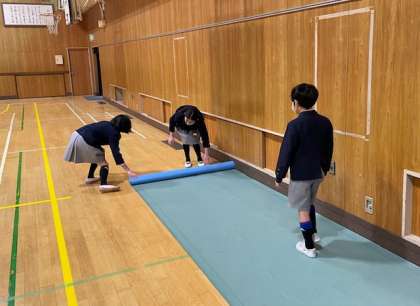 卒業式に向けた準備が進んでいます。講堂にシートを敷き、椅子を並べる作業は、卒業生のあとを継ぐ5年生の大切なお仕事です。