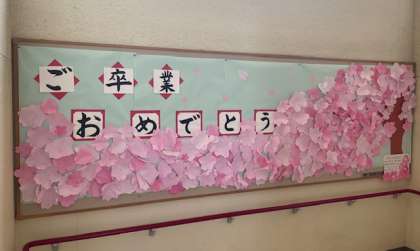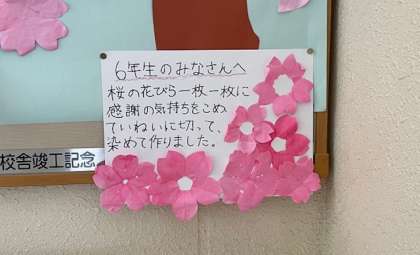 桜の花びら一枚一枚に、6年生への感謝の気持ちを込めて作りました。新校舎全体の雰囲気がとても華やかになりました。