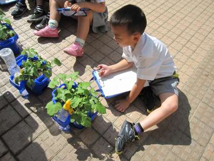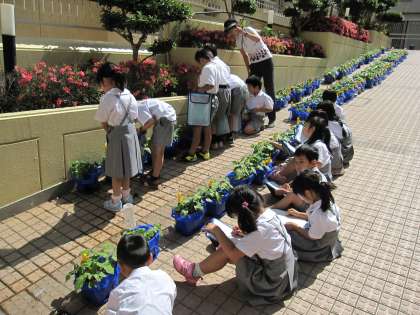 1年生が大切に育てているあさがおの本葉の観察をしました。