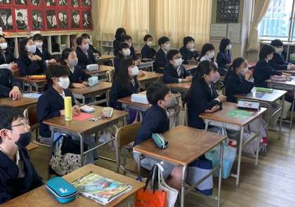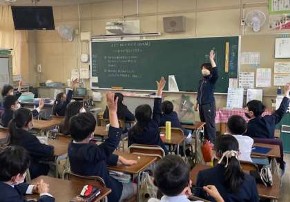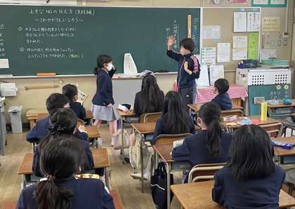 4年生の教室です。総合的な学習の時間に、友だちから誘われたけれど断らなければならない時に、どのような伝え方をすればよいかについて考えました。先生との役割演技をまじえながら、実践的な学習ができました。