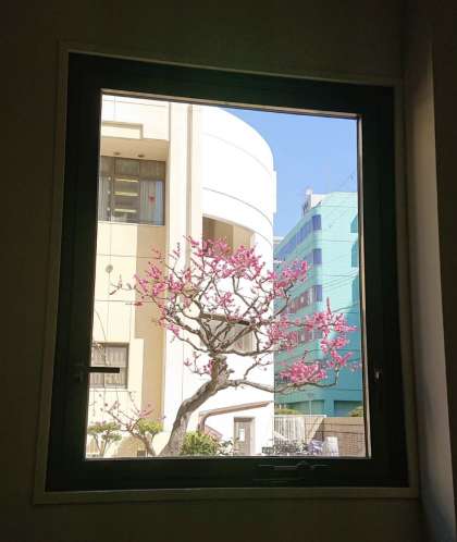 昨日ご紹介した紅梅を校舎内から見たところです。窓枠が額縁となり、まるで一枚の美しい絵のように見えます。6年生の卒業のお祝いにぴったりの作品です。
