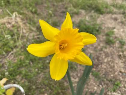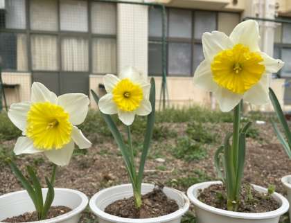 いま学習園では、スイセンの花がきれいに咲き誇っています。明日は、卒業生が通る花道に並べられます。あざやかな黄色が目にまぶしいです。