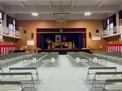 明日はいよいよ卒業式。会場は準備万端整いました。舞台は卒業生が登壇するのを静かに待っています。