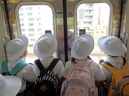 はじめに、大阪市を1周しているJR環状線に乗って、大阪市の様子を調べました。キッズプラザ大阪や通天閣など、15の景色を発見するミッションがあり、みんな真剣に窓の外を見て、見つけた時には小さな声で大喜びしていました。また、「たくさん人が乗り降りする駅があったよ!」「あの駅の周りには、ビルがたくさんあった!」など、それぞれの地域の特徴にも気づくことができました。