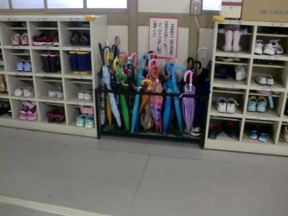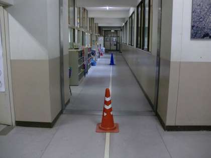 雨の日は廊下や階段が滑りやすく、けがや事故が起こりやすくなります。そのため、雨の日には各教室前にコーンを出し、「右側通行」と「走らず歩行する」の注意を呼びかけています。