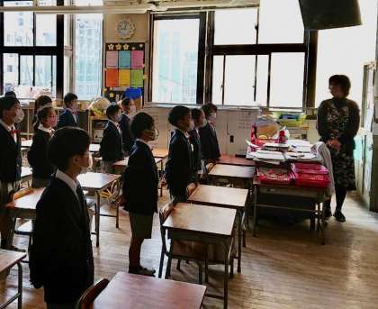 今年度の修了式・離任式をTeamsによっておこないました。大阪市歌を斉唱したあと、校長先生のお話を聞いています。