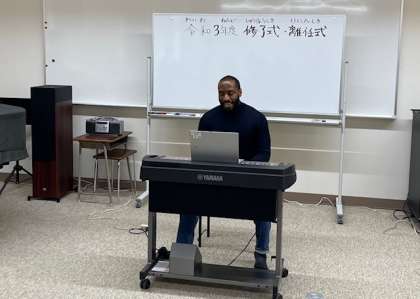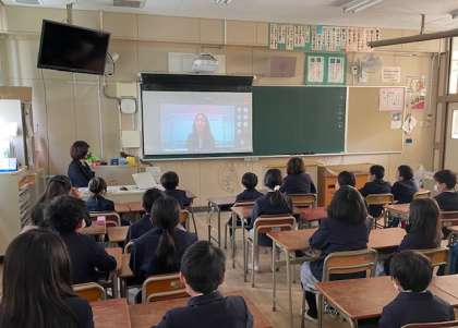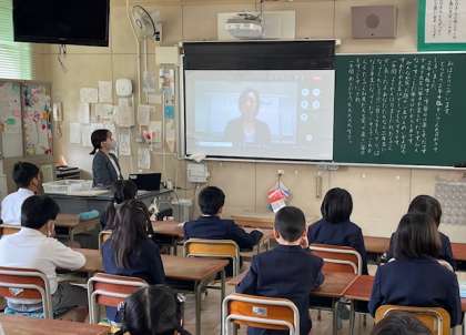 離任式では、転任される教職員のお別れのあいさつを聞きました。Teamsだと顔が見られるので、子どもたちに気持ちがよく伝わったようです。英語のメニー先生とはTeamsごしに英語でコミュニケーションをとりました。