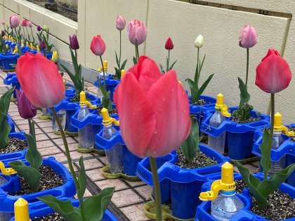 正門から入ったスロープのところに、昨年度の1年生が一生懸命に育てたチューリップが美しい花を咲かせています。新しい1年生のみなさんに対する歓迎の気持ちがこめられています。