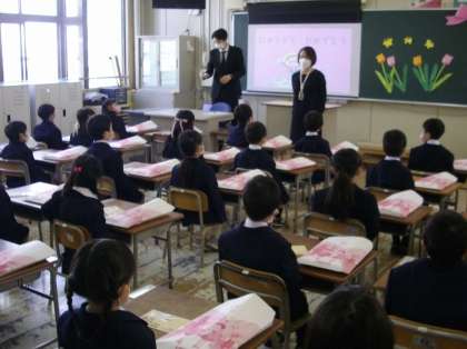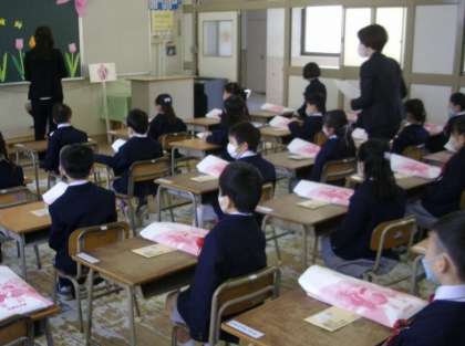 受付を終えたあと、自分たちの教室に入ります。式典開始の時刻まで、みんな緊張した面持ちで待っています。