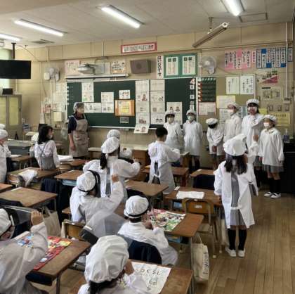 1年生の教室です。6年生が給食のおたすけ隊としてやってきてくれました。1年生にとっては、とても頼りになる先輩です!